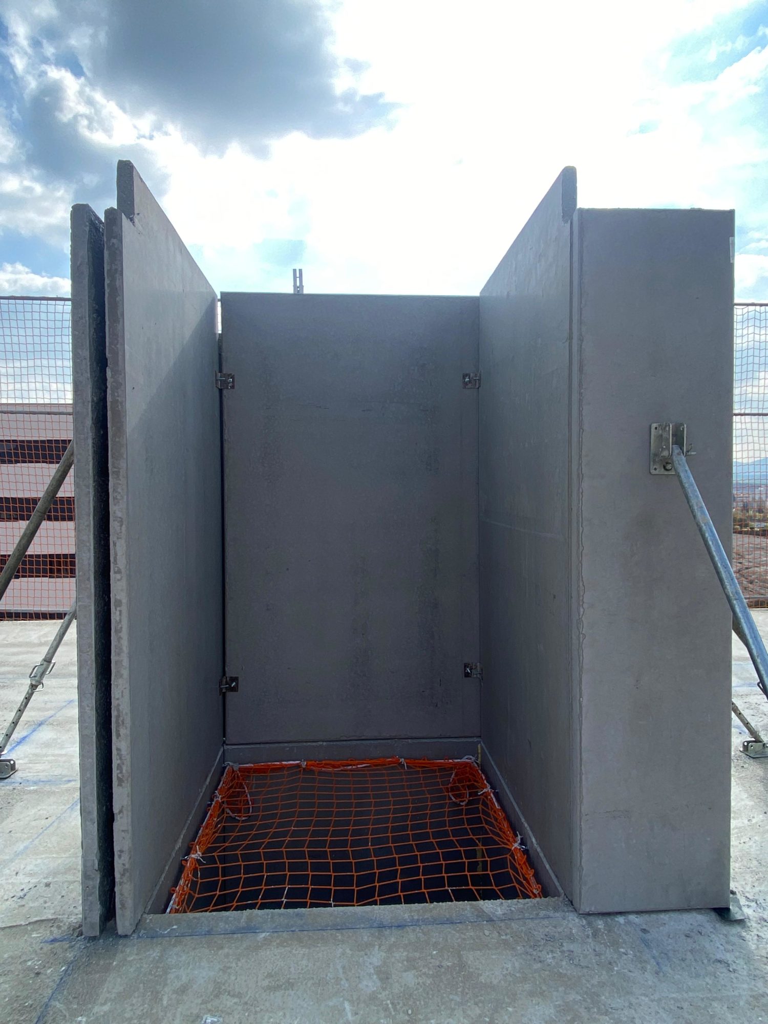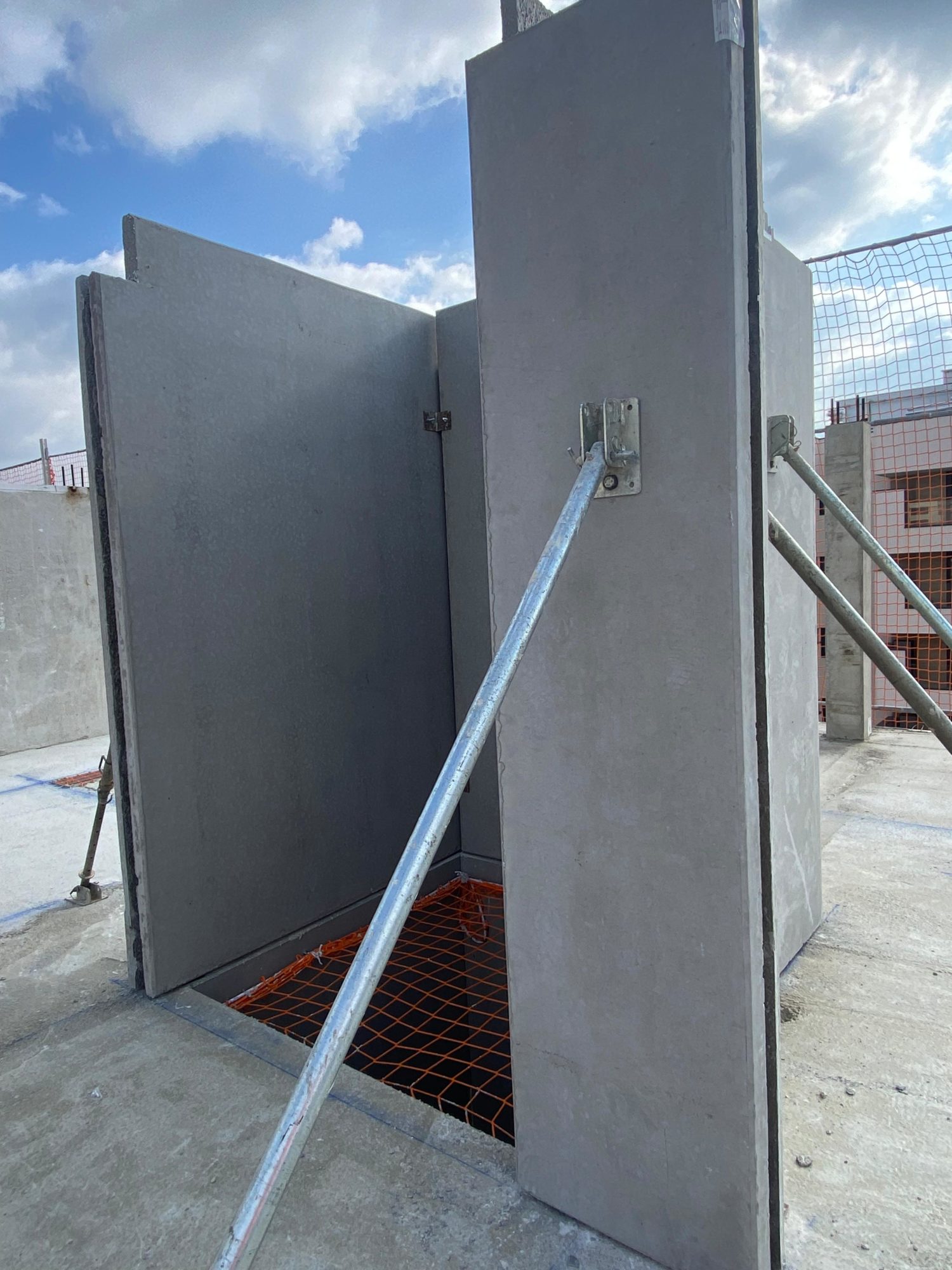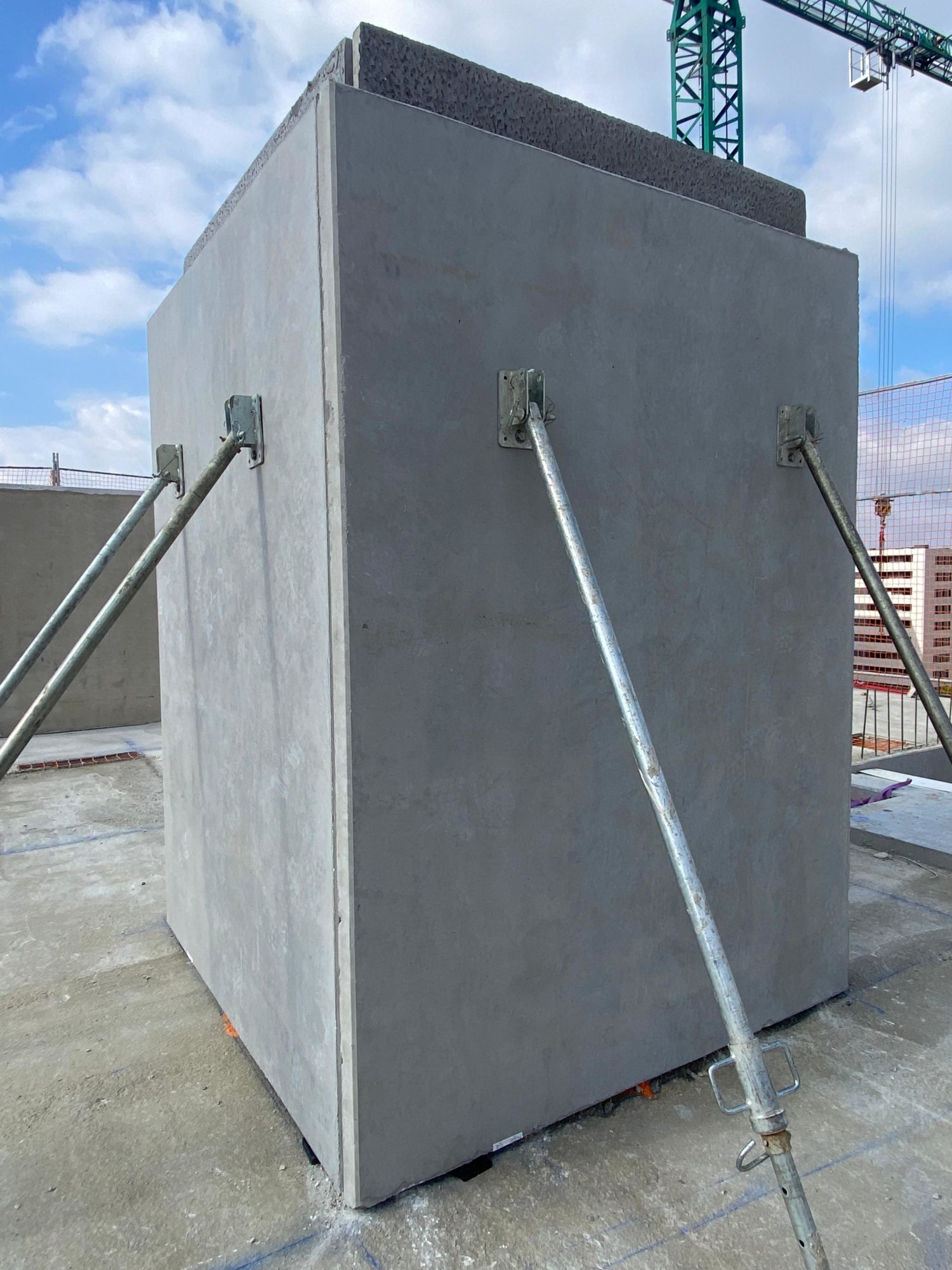Empleamos espesores totales de entre 18 y 25 cm. Este tipo de estructuras se prefabrican para toda la altura del edificio desde la cimentación hasta los casetones de cubierta. La altura de las pantallas suele ser de 350 metros pero siempre nos adaptamos a las exigencias del proyecto.